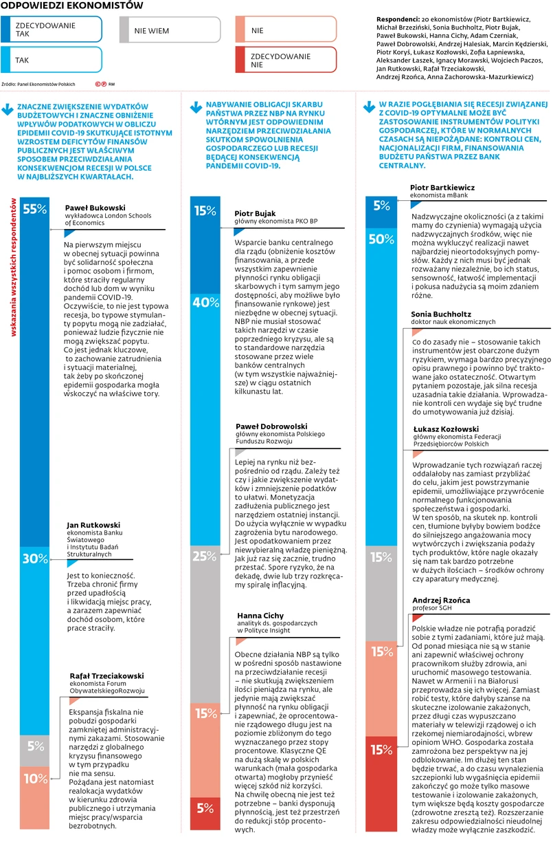 Zdecydowana większość (85 proc.) mówi „tak” dla znacznego zwiększenia wydatków budżetowych, aby przeciwdziałać recesji w najbliższych kwartałach. To zaś będzie wymagało od rządu akceptacji spadku dochodów podatkowych i istotnego wzrostu deficytu. Większość przychylnie patrzy także na budzący kontrowersje zakup obligacji skarbowych przez bank centralny.