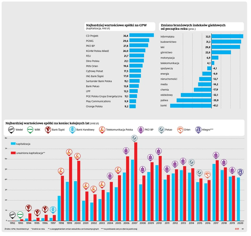 Spadki z ostatnich lat, które najmocniej dotykały sektory będące wcześniej mocną stroną GPW, jak banki, spółki energetyczne czy surowcowe, spowodowały, że w gronie liderów zaczął się pojawiać prywatny biznes – z nowych branż, które dziś cieszą się większym wzięciem wśród inwestorów. Na czele listy najbardziej wartościowych spółek na warszawskim parkiecie w ostatnich kilku miesiącach był CD Projekt. Zapewne nowym liderem zostanie Allegro. Debiut tej spółki sprawi, że w pierwszej dziesiątce firm z najwyższą kapitalizacją będą cztery, które powstały jako krajowe prywatne przedsięwzięcia. Oprócz wymienionych to także sieć sklepów Dino i Cyfrowy Polsat (choć jego główną częścią jest operator telekomunikacyjny Polkomtel uruchomiony w latach 90. przez firmy państwowe).