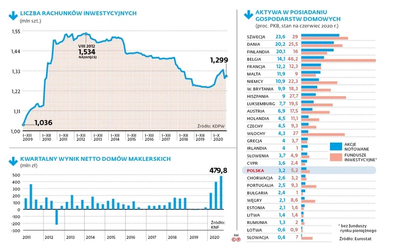 Chociaż na naszej giełdzie nie było tak spektakularnych wzrostów cen akcji jak na głównych światowych rynkach, i u nas widać wzrost zainteresowania dokonywaniem transakcji. Od lutego do sierpnia liczba rachunków inwestycyjnych w krajowych biurach i domach maklerskich (obejmuje nie tylko rachunki inwestorów indywidualnych) zwiększyła się o niemal 80 tys., do 1,34 mln. Największy wzrost miał miejsce w marcu, czyli w pierwszym miesiącu pandemii – wtedy przybyło prawie 29 tys. kont.