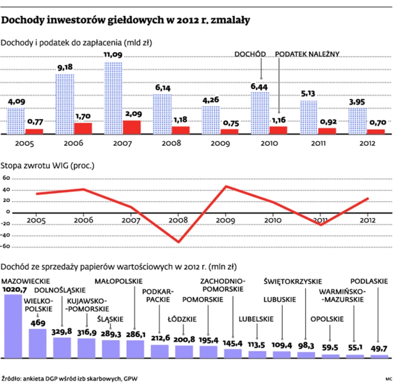 Blisko 1,2 mld zł mniej zarobili w ubiegłym roku indywidualni giełdowi inwestorzy. W zeznaniach podatkowych za 2012 rok wykazali niespełna 4 mld zł dochodów, podczas gdy rok wcześniej było to ponad 5 mld zł.