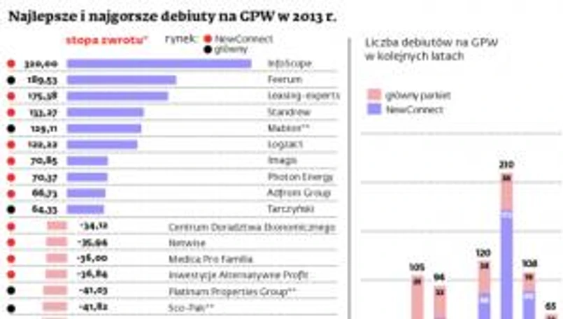 A jakie były debiuty mijającego roku? Na zamknięciu sesji 30 grudnia kursy większości spółek, które weszły do notowań w 2013 r., były wyższe niż cena z oferty publicznej (lub kurs odniesienia). Numerem jeden wśród nich było InfoScope, spółka, która zajmuje się projektowaniem i wdrażaniem systemów informatycznych. Jej papiery weszły do notowań na NewConnect w połowie czerwca. Już na otwarciu w dniu debiutu ich cena sięgnęła 7,5 zł, co oznaczało wzrost kursu o blisko 67 proc. Na początku tego miesiąca za walory tej spółki płacono już 25 zł. Jej ostatni kurs to 18,9 zł, co oznacza stopę zwrotu przekraczającą 320 proc.