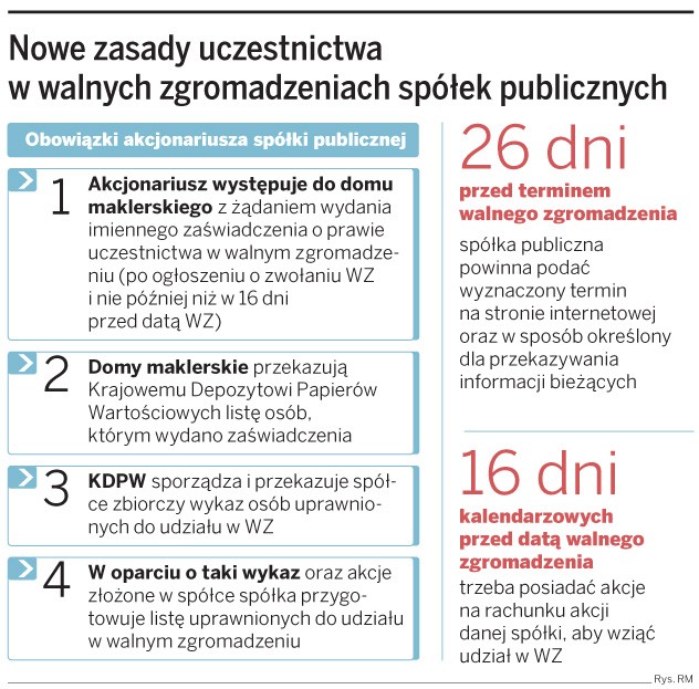 Jeszcze tylko półtora miesiąca pozostało spółkom akcyjnym na zorganizowanie zwyczajnych walnych zgromadzeń. W tym roku po raz pierwszy aby wziąć udział w głosowaniu, nie wystarczy być akcjonariuszem. Trzeba jeszcze wystąpić do domu maklerskiego z żądaniem wydania imiennego zaświadczenia o prawie uczestnictwa w zgromadzeniu. Od wejścia w życie znowelizowanych przepisów kodeksu spółek handlowych, tj. od 3 sierpnia 2009 r., posiadacze akcji zdematerializowanych (czyli tych, które zamiast papierowej formy funkcjonują w postaci komputerowego zapisu) nie muszą też blokować akcji do czasu zakończenia zgromadzenia.