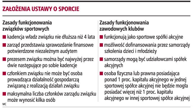 Takie rozwiązanie akceptuje Ministerstwo Sportu. Chce, aby związki sportowe działały zgodnie z zasadami ładu korporacyjnego. Ma w tym pomóc choćby to, że zarządy związków będą, tak jak w przypadku korporacji, liczyły po kilka osób, a nie kilkadziesiąt.